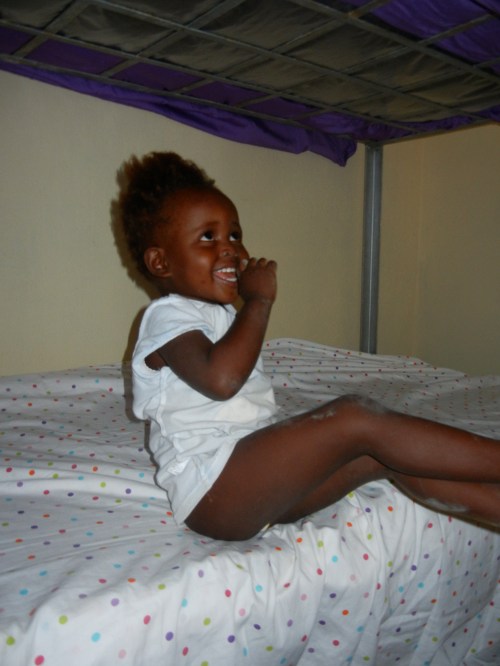 a very excited Marantha sitting on her new bed